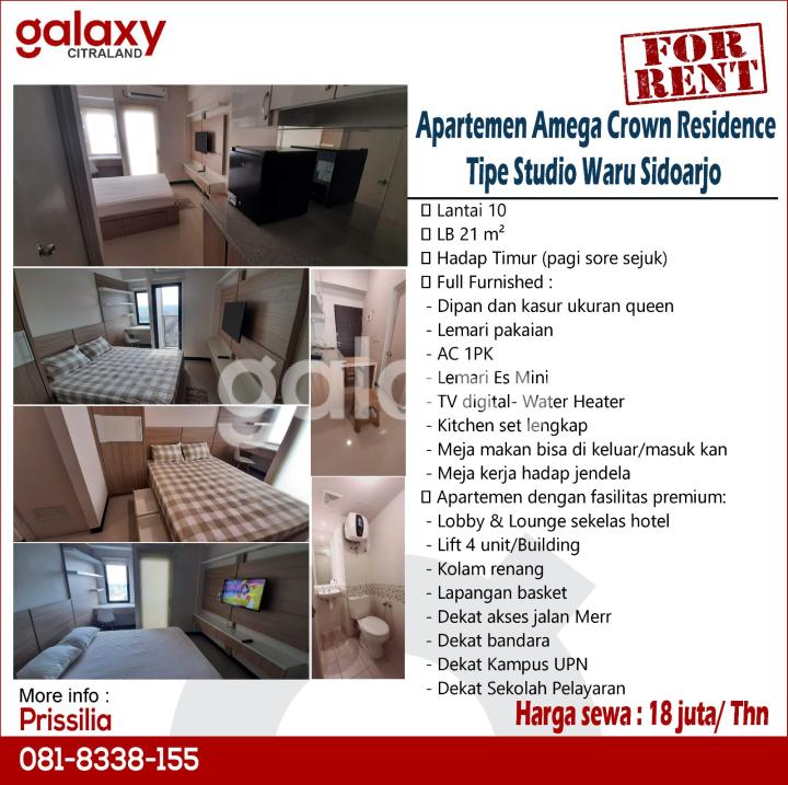 Disewakan Apartemen Amega Crown Residence Tipe Studio Waru Sidoarjo Lantai 10 LB 21 m² Hadap Timur (pagi sore sejuk) Full Furnished : - Dipan dan kasur ukuran queen dilengkapi dengan 4 laci2 penyimpanan - Lemari pakaian - AC 1PK - Lemari Es Mini - TV digital - Water Heater - Kitchen set lengkap kompor, tempat cuci piring, peralatan masak & makan - Meja makan bisa di keluar/masuk kan - Meja kerja hadap jendela Apartemen dengan fasilitas premium: - Lobby & Lounge sekelas hotel - Lift 4 unit/Building - Communal space/co working space - Kolam renang - Lapangan basket - Laundry (berbayar) - Indomart - Food-drink court - Dekat akses jalan Merr - Dekat bandara - Dekat Kampus UPN - Dekat Sekolah Pelayaran Harga sewa : 18 JT / thn Hubungi: Prissilia Galaxy Citraland