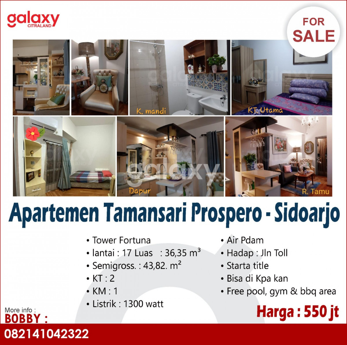 Di Jual Apartemen Tamansari Prospero - Sidoarjo Tower Fortuna lantai : 17 Luas : 36,35 m³ Semigross. : 43,82. m² KT : 2 KM : 1 Listrik : 1300 Watt Air PDAM Hadap : Jalan Toll Starta Title Bisa Di KPA kan Free Pool, Gym & BBQ Area Harga : 550 Juta Hubungi : Bobby 082141042322 Galaxy Citraland