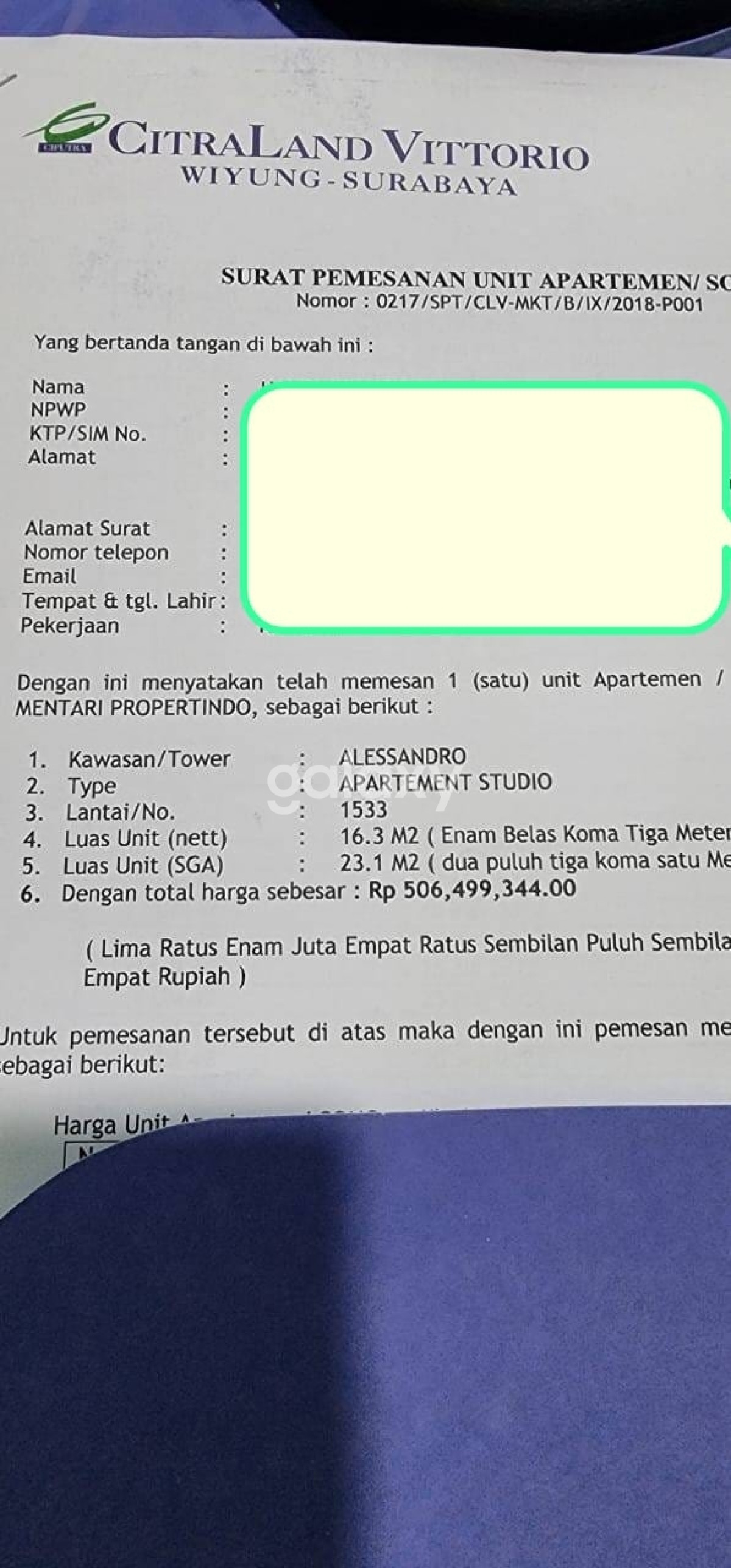 Dijual dibawah harga jual / dijual Rugi Apartemen Vittorio type studio