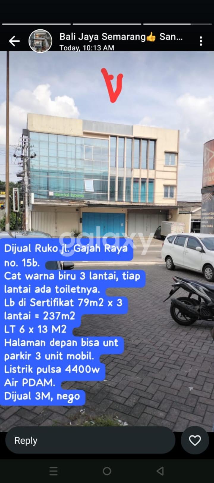 Dijual/sewakan Ruko di Jl Gajah Raya, Gayamsari Semarang Luas Tanah: 78m2 (6x13)m Luas Bangunan: 237m2 (79x3)m Kamar Mandi: 3 Listrik: 4400 watt Air: PDAM Garasi: Terbuka 3 mobil Harga Sewa: 125 juta/thn