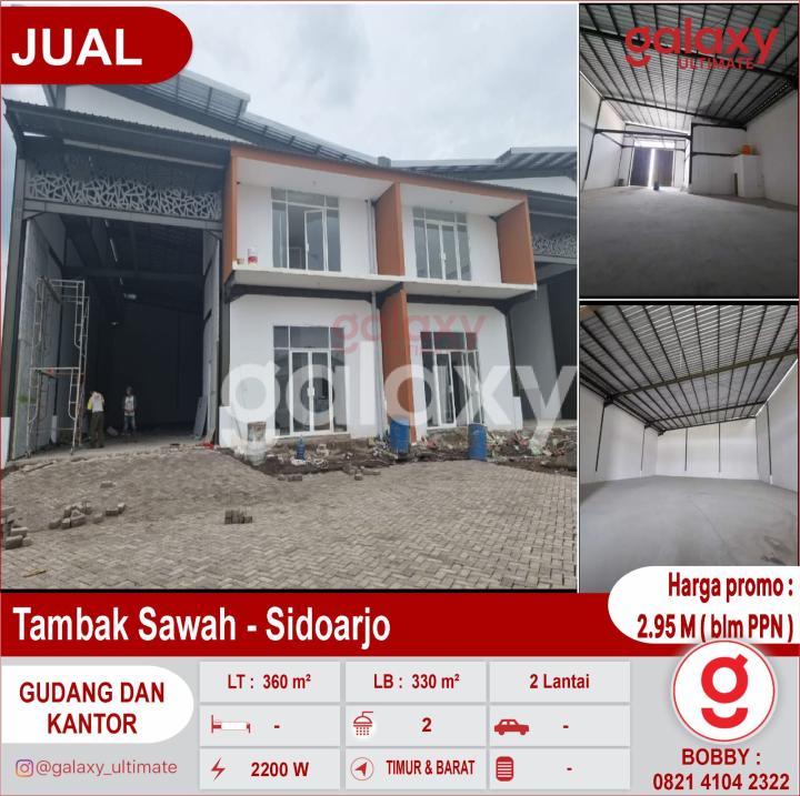 New Warehouse di Tambak sawah - Sidoarjo dekat Tol, Tropodo & Pondok Tjandra GRAND TAMBAK SAWAH, konsep 3 in 1 Warehouse Office Workshop Luas Tanah 360 m² Dimensi (15 x 24 ) Luas Bangunan 330 m² Dimensi (15 x 22 ) Kantor 72 m² Dimensi (6 x 6 , 2 lantai ) 2 toilet Spesifikasi : - double talang - double tembok - tinggi gudang 9 meter - ada balkon untuk kantor di lantai 2 - kantor bisa diperluas menjadi 3 lantai PLN 2200 watt Ijin industri dan pergudangan Row jalan 19 meter Hadap timur / barat Air PDAM & Sumur Bebas banjir Keamanan 24 jam Pembayaran ringan, cukup dp 10%, sisanya 90% dicover bank ( KPG ) Buruan pilih unitnya Harga promo : 2.95 M ( blm PPN ) More Info : Bobby Galaxy Ultimate