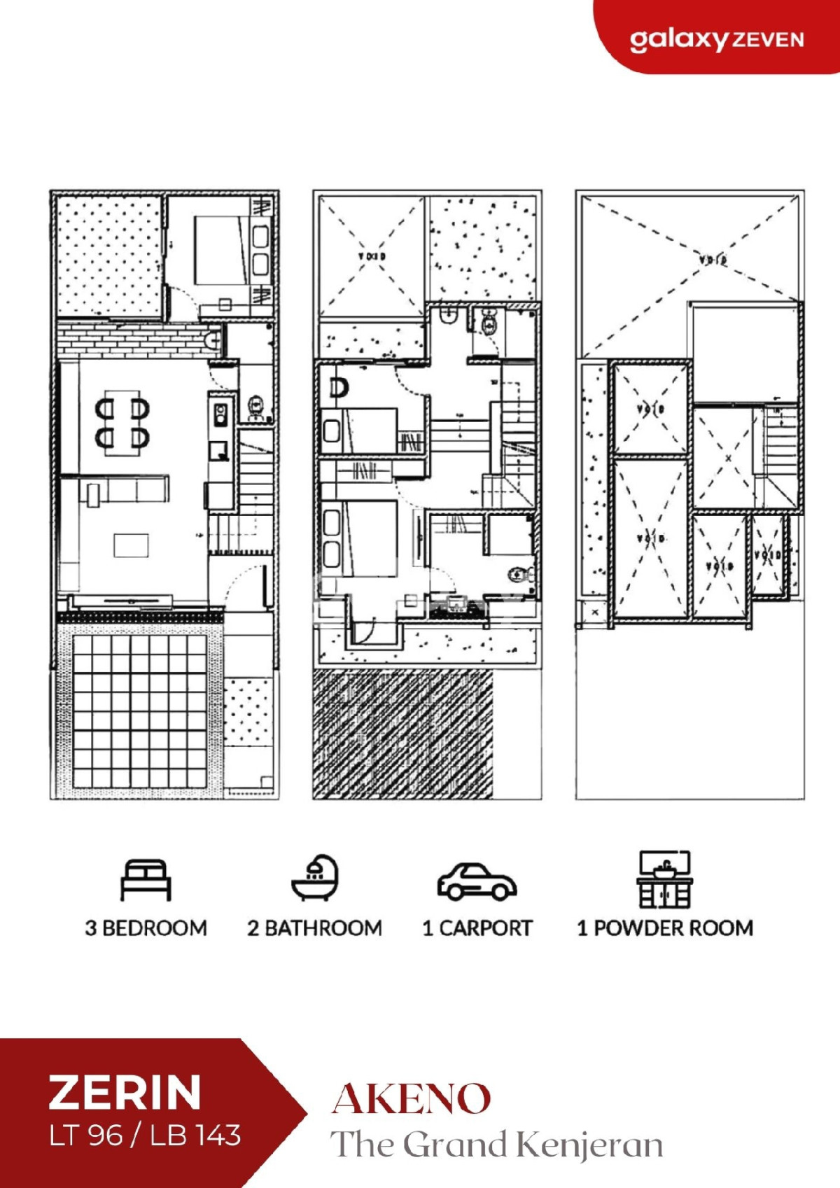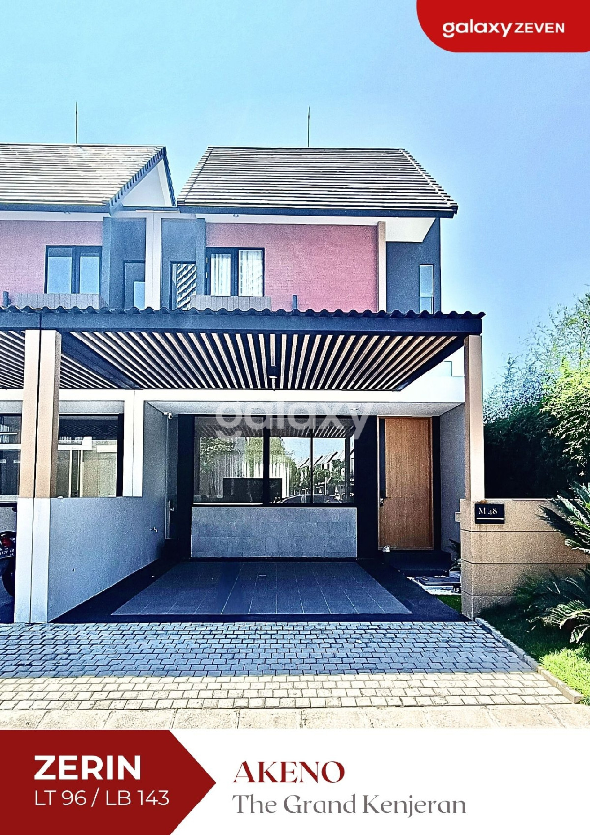 tgk-zerin Akeno Z-Series sangat sesuai untuk keluarga kecil maupun keluarga baru yang akan memulai kisah baru seiring dengan matahari yang menyingsing di pagi hari. Mengedepankan SIMPLICITY | SMART | AESTHETIC Living JUAL RUMAH BARU COMPACT 2 LANTAI MINIMALIS KONSEP JEPANG THE GRAND KENJERAN SURABAYA TIMUR TIPE ZERIN LEBAR 6 LT 96 ( 6x16 ), LB 143 2 Lantai, KT 3, KM 2+1 1 Carport, Taman PLN 3.500 HGB, Hadap Selatan Harga Promo 2.616.188.717* *Bisa berubah sewaktu-waktu FASILITAS OUTDOOR: - Hana Lake Terrace - Panoramic Swing - Jogging Track - Kid Playground - Niji Picnic Ground - dan Co-Working Space LOKASI/JARAK: 1 km - Alfamart The Grand Kenjeran 1,4 km - Raya Kenjeran 2 km - RS Mitra Keluarga 2,3 km - Raya MERR, RS Ibu Anak Kendangsari Merr 5,4 km - Pakuwon City Mall 6 km - Galaxy Mall 8,2 km - Stasiun Gubeng 19 km - Juanda Airport SPESIFIKASI BANGUNAN 1) PONDASI : - Tiang pancang 2) DINDING : - Bata ringan putih + aci cat dinding - Kamar mandi finishing keramik ex. Roman 3) LANTAI : Granite tile ex. Roman 4) PLAFOND : - Interior gypsumboard ex. Elephant finishing cat - Eksterior MR board ex. Elephant finishing cat 5) ATAP : - Rangka atap baja ringan - Genteng beton CP accent hitam 6) PINTU & JENDELA : - Pintu utama solid engineering wood meranti finishing HPL - Pintu dalam semi solid engineering wood meranti finishing HPL - Hardware Accesories by Dekkson - Jendela aluminium Madela by YKK AP 7) SANITAIR : - Wastafel, kran, closet, shower ex TOTO 8) LISTRIK : - 3.500 watt 9) AIR BERSIH : - PDAM + tandon bawah 1,5 m³