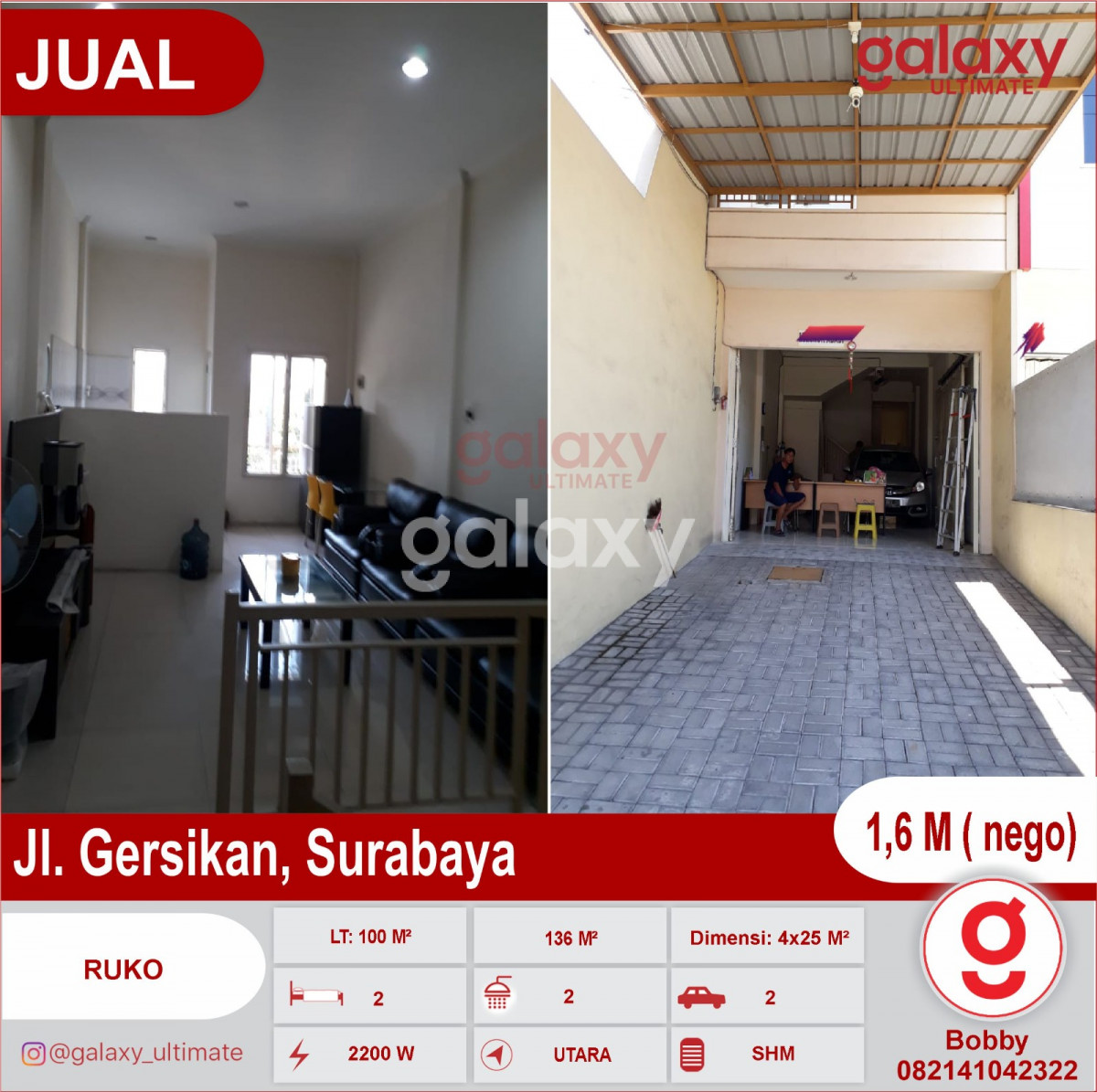 Dijual Cepat ruko di Jl. gersikan, Surabaya ✓ LT: 100 M² ✓ LB: 136 M² ✓ Dimensi: 4x25 M² ✓ KT : 2 / KM : 2 ✓ PLN 2200 W / PDAM ✓ Row : 2 mobil ✓ Hadap: Utara ✓ Sertifikat : SHM Harga : 1,6 M ( nego) Note: ✓ Truck roda 8 boleh masuk ✓ Nol jalan ✓ Daerah padat penduduk ✓ Dekat pasar ✓ Cocok untuk usaha: Kantor, pegadaian, praktek dokter,apotik,salon, travel,resto, cafe atau gudang dll Hubungi: Bobby Galaxy Ultimate One Stop Property Consultant