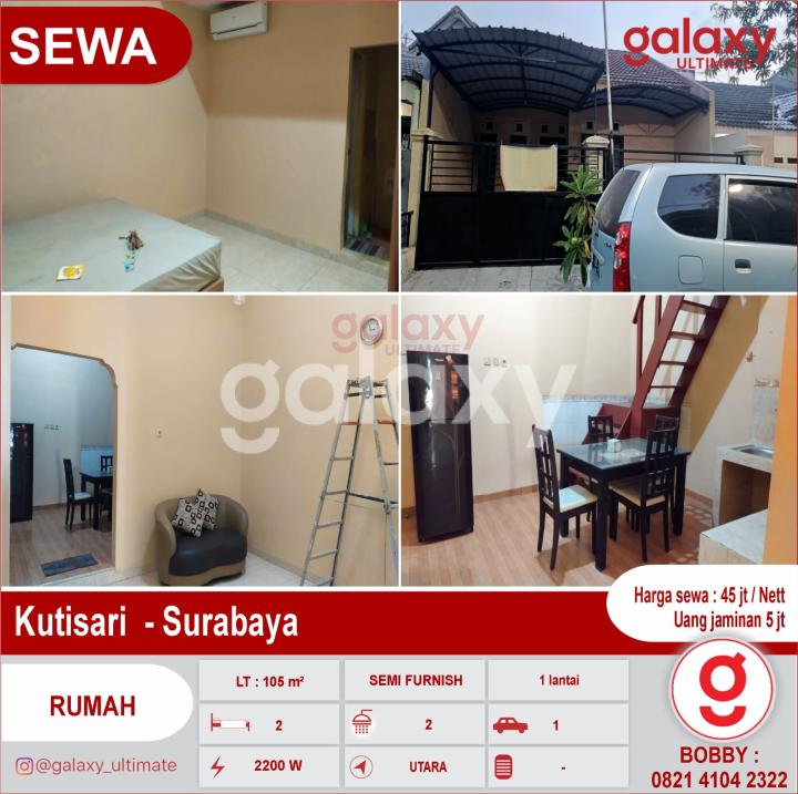 Di Sewakan Rumah Kutasari - Surabaya LT : 105 ( 7 x 15 ) Bangunan 1 lantai KT : 2 / KM : 2 PLN 2200 W / PDAM Hadap Utara Carport 1 mobil Row jln 2 mobil loss Semi Furnish Harga : 45 jt / Thn Uang jaminan 5jt Hubungi : Bobby Galaxy Ultimate