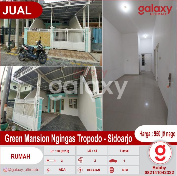 Di Jual Rumah Green Mansion Ngingas Tropodo - Sidoarjo * siap huni * one gate sistem cctv 24 jam * dekat bandara juanda LT : 90 (6x15) LB : 45 / 1 lantai KT : 3 / KM : 2 PLN & PDAM Hadap selatan Carport 1 mobil Row jln 2 mobil SHM Harga : 950 jt/ nego Hubungi : Bobby Galaxy Ultimate 082141042322 https://bobbygunawan.agenproperti123.com