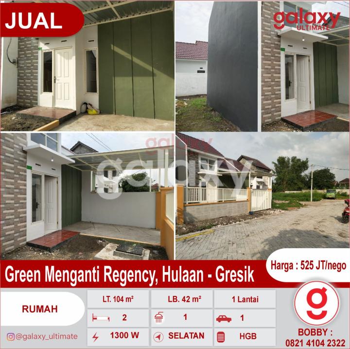 Perum Green Menganti Regency, Hulaan - Gresik Barat nya Surabaya, pasar Menganti & Pakal Benowo * Luas Tanah : 104 m² * Dimensi 8 x 13 m² * Luas Bangunan : 42m² * Kamar Tidur : 2 * Kamar Mandi : 1 * Rumah 1 lantai * Hadap Selatan * Sertifikat HGB (On Hand), IMB lengkap * Listrik 1300watt * PDAM * Tandon Bawah * Pagar, Canopy * Carport 1 mobil * Row jalan 2 mobil Harga : 525 jt /nego tipis More info : Bobby Galaxy Ultimate