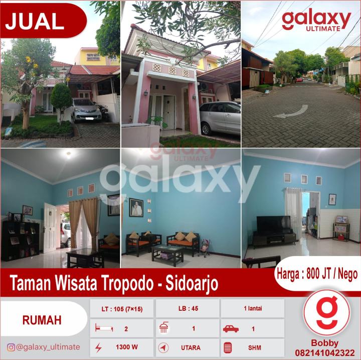 Di Jual Rumah Taman Wisata Tropodo - Sidoarjo 5 menit ke Superindo, 10 menit ke airport & mepet sby LT : 105 (7×15) LB : 45 / 1 lantai KT : 2 / KM : 1 PDAM / PLN 1300 W Hadap Utara SHM Plafon Tinggi (3,5 Meter) RUANG MAKAN DAPUR RUANG KELUARGA TAMAN BELAKANG + TEMPAT JEMURAN CARPORT 1 MOBIL TANDON BAWAH POMPA AIR LEBAR JALAN 3 MOBIL Lingkungan tenang, aman dan nyaman Keamanan 24 Jam One Gate Harga : 800 JT / Nego sampai deal Hubungi Bobby Galaxy Ultimate 082141042322 https://bobbygunawan.agenproperti123.com