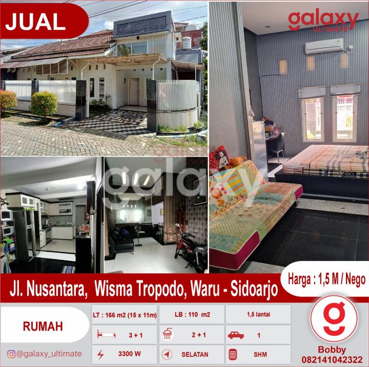 DiJual Rumah Jl. Nusantara, Wisma Tropodo, Waru - Sidoarjo •LT : 166 m2 (15 x 11m) •LB : 110 m2 •1 1/2 Lantai •Sertifikat SHM •kamar tidur 3 + 1 •Kamar mandi 2 + 1 •Dapur Kitchen Set •Carport 1 mobil •Daya PLN 3300 watt •PDAM + Sumur bor •Gas Negara PGN •Hadap rumah Selatan •Row jalan 2,5 mobil •Lokasi sangat strategis dekat Merr, Toll & Airport Harga : 1,5 M / Nego Hubungi : Bobby Galaxy Ultimate 082141042322 https://bobbygunawan.agenproperti123.com