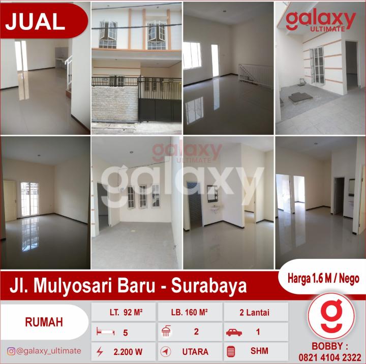 Di Jual Rumah Jl Mulyosari Baru - Surabaya Luas Tanah : 92 M² Luas Bangunan : 160 M² Dimensi 7,5 x 12,5 M² Bangunan 2 Lantai Lantai Granit Lantai 1 1 Kamar Tidur, 1 Kamar Tidur Art 1 Kamar Mandi Lantai 2 3 Kamar Tidur 1 Kamar Mandi SHM Hadap Utara Air PDAM PLN 2.200 W 2 Tandon Air atas bawah Mesin Pompa Air 2 Ex House Fan Atap Kusen Pintu Jendela Gafalum Row Jalan 2 Mobil Carport 1 Mobil Harga 1.6 M / Nego More Info : Bobby Galaxy Ultimate