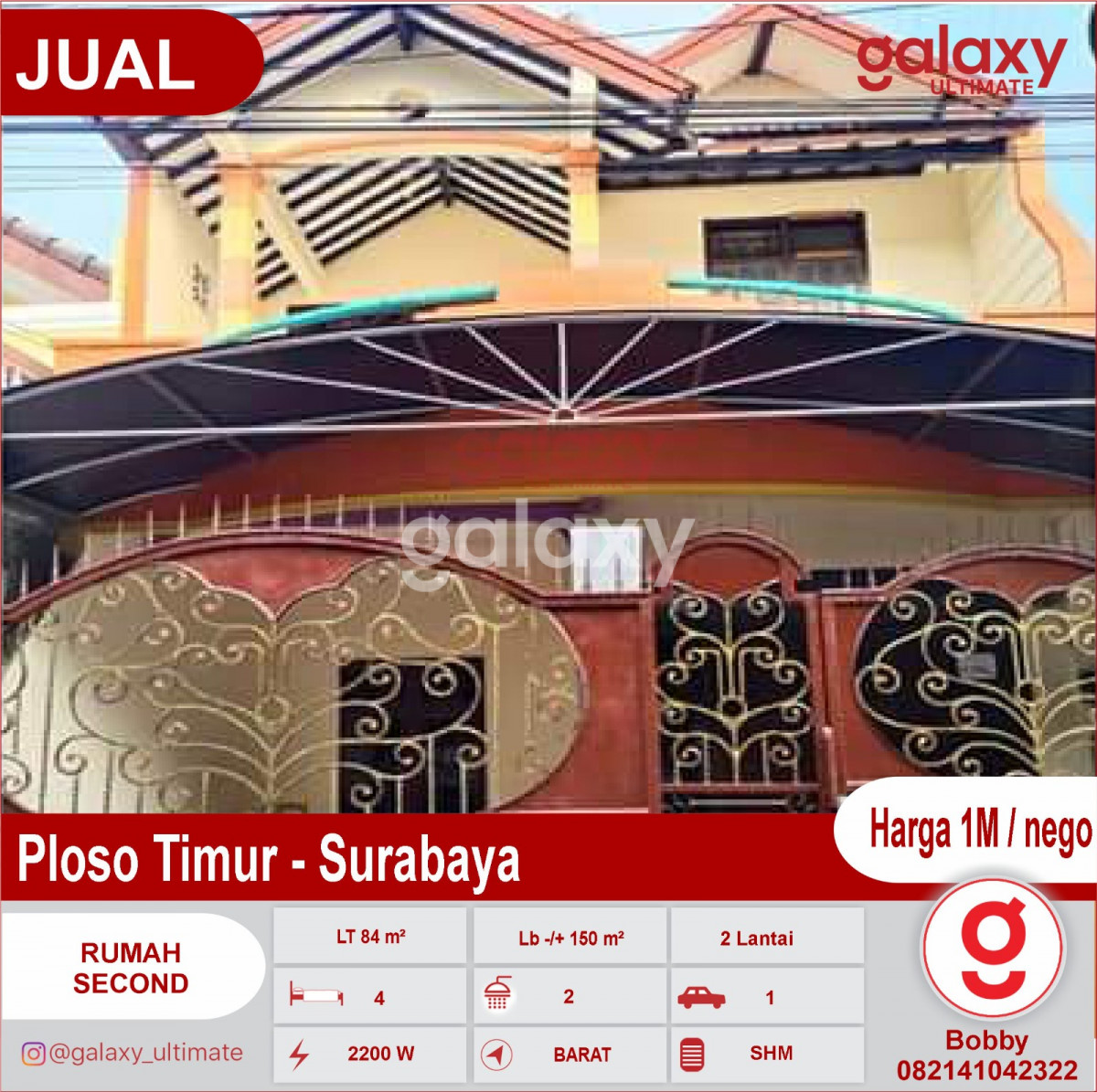 Di Jual Rumah Second Ploso Timur - Surabaya dekat kalijudan, karang asem, karang empat & kenjeran Dimensi 6x14 m² Lt 84 m² Lb -/+ 150 m² Bangunan 2 lantai Hadap Barat KT 4 KM 2 PLN 2200 W / PDAM Row jalan 2 mobil Carport 1mobil SHM Harga 1M / nego Hubungi : Bobby Galaxy Ultimate 082141042322