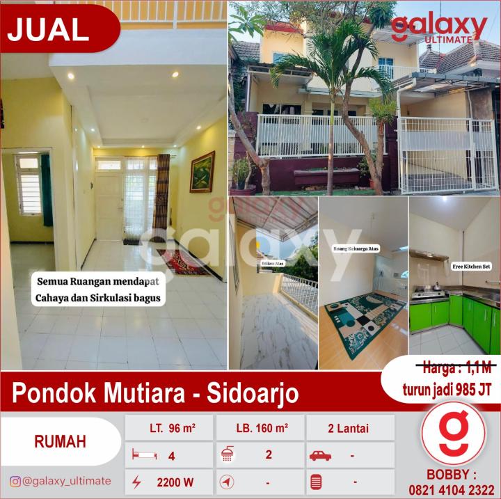 Di Jual Rumah Pondok Mutiara - Sidoarjo Luas Tanah : 96 m² Luas Bangunan : 160 m² Dimensi 8 x 12 m² 2 Lantai. Rangka Atap Galvalum anti rayap . Kamar Tidur : 4 1 ruang kamar ART / bisa utk gudang ( terpisah dari rumah induk ) Kamar Mandi : 2 1 ruang musholah keluarga 1 ruang keluarga di atas. ruang teras depan dan carport Teras Atas ( Balkon) GRATIS 1 AC di ruang keluarga Gratis Kitchen Set Portable Gratis 3 Exhaust fan Gratis Tandon Air Atas dengan 2 pompa Air Listrik 2200 Watt. Kondisi aman, dan bebas Banjir. Pusat Kota - Dengan lingkungan : Depan mall Lippo plaza Depan RS Delta Surya. Pas Di depan Exit Tol kota Sidoarjo. Dekat sarana Ibadah/ Pendidikan dll. Dekat kantor Cabang Perbankan.( Bank Mandiri, BCA dan BNI ) Dekat hotel Luminor. Harga : 1,1 M turun jadi 985 JT More Info : Bobby Galaxy Ultimate