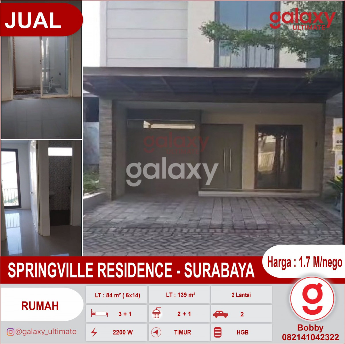 Di Jual Rumah SPRINGVILLE RESIDENCE - SURABAYA dekat Transmart, Ubaya & Merr LT : 84 m² ( 6x14) LT : 139 m² 2 lantai KT : 3 + 1 KM : 2 + 1 (1 KM dalam) PLN : 2200 W / PDAM Carport : 2 mobil Row Jln 3 mobil (12 m²) Sertifikat : HGB Hadap : Timur Harga : 1.7 M (nego tipis, jual rugi di bawah hrg developer) Hubungi : Bobby Galaxy Ultimate 082141042322 https://bobbygunawan.agenproperti123.com