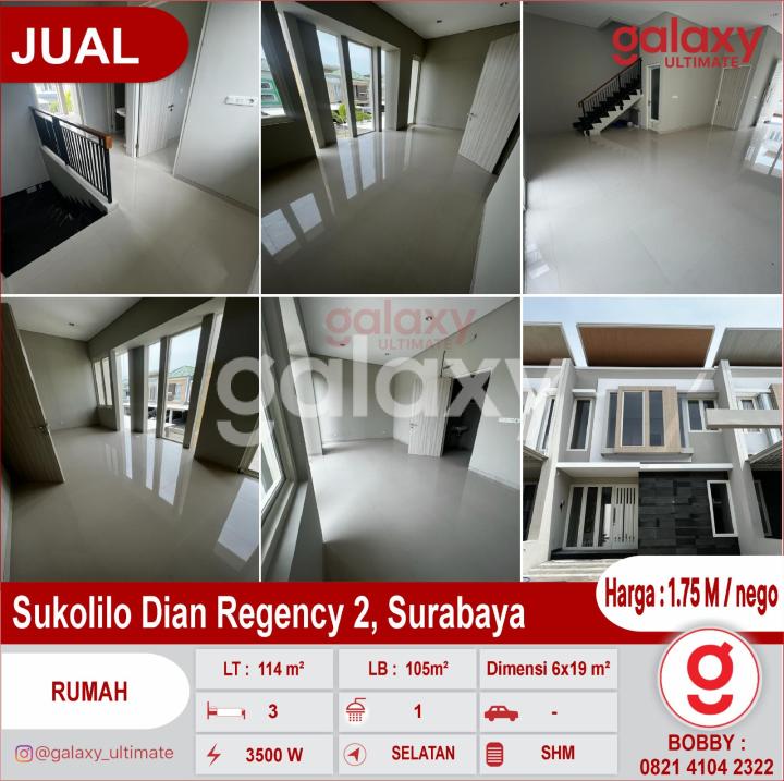 Rumah Baru Gress ada 2 rumah Sukolilo Dian Regency 2, Surabaya dekat Universitas Hangtuah, Keputih & Apartemen Sukolilo Dian Regency Luas Tanah : 114 m² Dimensi 6x19 m² Luas Bangunan 105 m² Hadap Selatan Kamar Tidur : 3 Kamar Mandi 1 & 1 Powder Room Lantai & Kamar mandi Granite Tile 60x60 KW1 Motif Sanitary Toto Atap Galvalum Cat Weldon/Setara Kusen Aluminium Pintu Kayu finishing HPL Lampu Down Light sdh terpasang SHM Listrik 3500 Watt SERTIFIKAT READY & BISA KPR KOLAM RENANG OPTIONAL FREE PANTRY Harga : 1.75M / nego More Info : Bobby Galaxy Ultimate