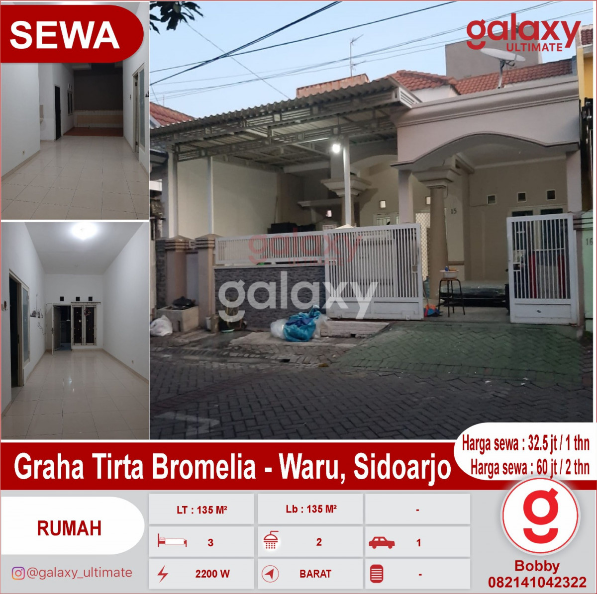 Di Sewakan Rumah Graha Tirta Bromelia - Waru, Sidoarjo LT : 135 M² ( 9x15 ) Lb : 135 M² full bangunan KT : 3 / KM : 2 Dapur. Tandon. Pln 2200 Watt / Pdam Carport 1 mobil Row jln 2 mobil loss Harga sewa : 32.5 jt / 1 thn Harga sewa : 60 jt / 2 thn Hubungi : Bobby Galaxy Ultimate 082141042322 https://bobbygunawan.agenproperti123.com