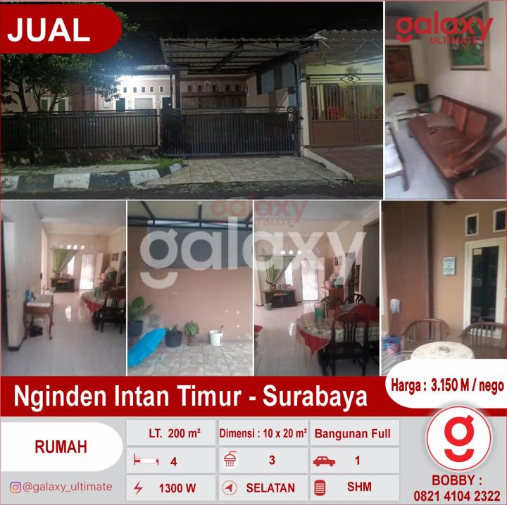 Dijual rumah di nginden intan timur - Surabaya Luas Tanah : 200 m² Dimensi : 10 x 20 m² Bangunan Full kamar tidur bawah : 3 kamar mandi : 2 ruang makan dan ruang tamu lantai atas 1 kamar tidur art 1 kamar mandi art, dan jemuran. Surat Hak Milik (SHM) Listrik 1300 wat Hadap selatan Carport 1 mobil Row jalan 2 mobil Harga : 3.150 M / nego. More Info: Bobby Galaxy Ultimate