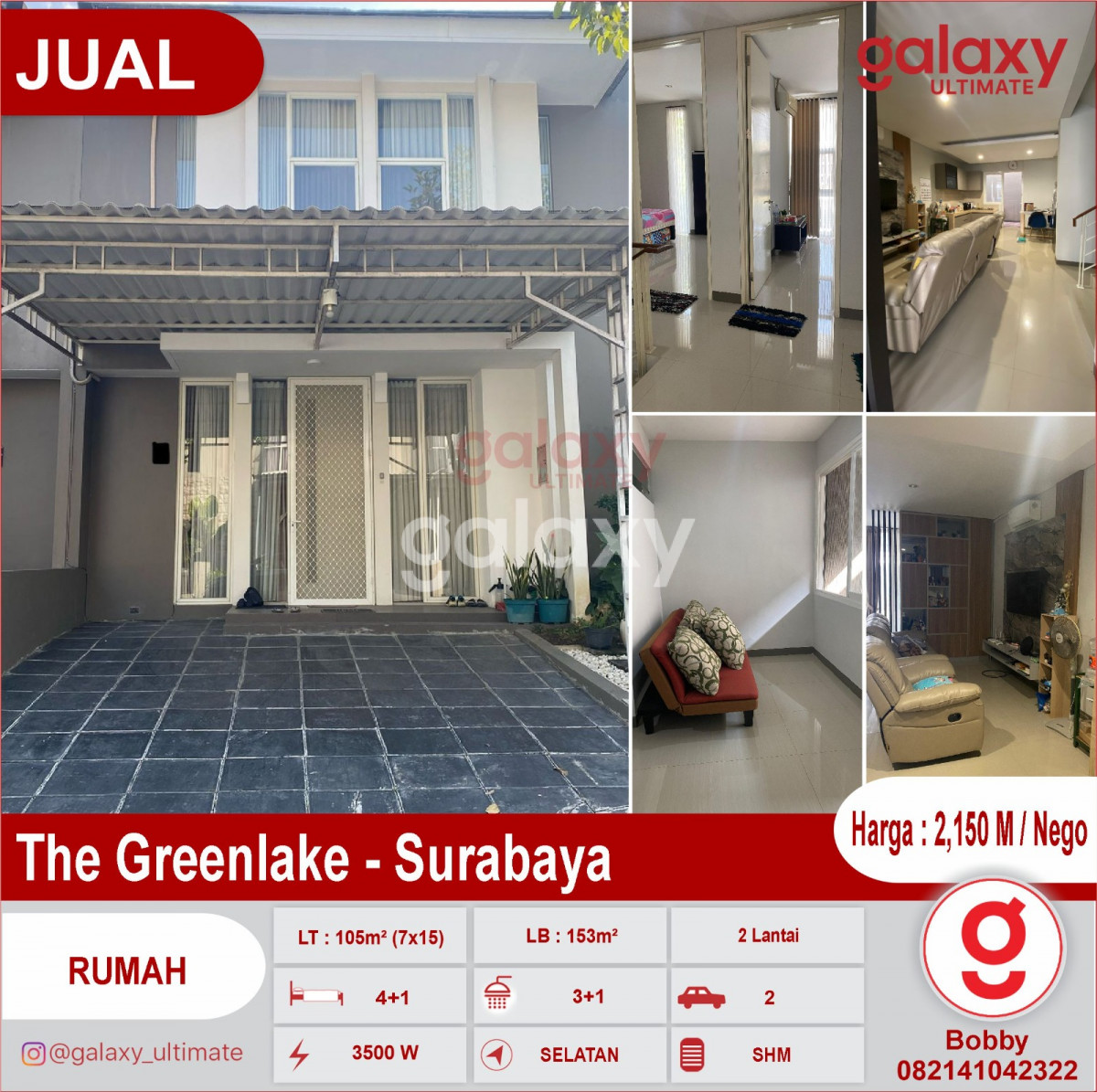Super Murah Citraland The Greenlake - Surabaya - Luas Tanah 105m² (7x15) - Luas Bangunan 153m² - Kamar Tidur 4+1 - Kamar Mandi 3+1 - balkon di LT 2 dengan area kosong untuk yoga - Full furnished (kitchen set modern, AC 4, meja makan + kursi, kulkas, tv, bed, lemari, partisi) - PLN 3500 watt - SHM - Bangunan siap huni, tidak perlu perluasan karena sudah tambah bangunan - Row jalan depan rumah 3 mobil - Carport 2 mobil - Canopy Luar + dalam Keunggulan : - Lokasi strategis - Dekat gwalk, national hospital, pakuwon mall - Bebas banjir - Lingkungan aman dan nyaman - keamanaan 24 jam - 20 menit menuju tol - Air Citraland Harga : 2,150 M / Nego Hubungi : Bobby Galaxy Ultimate 082141042322 https://bobbygunawan.agenproperti123.com