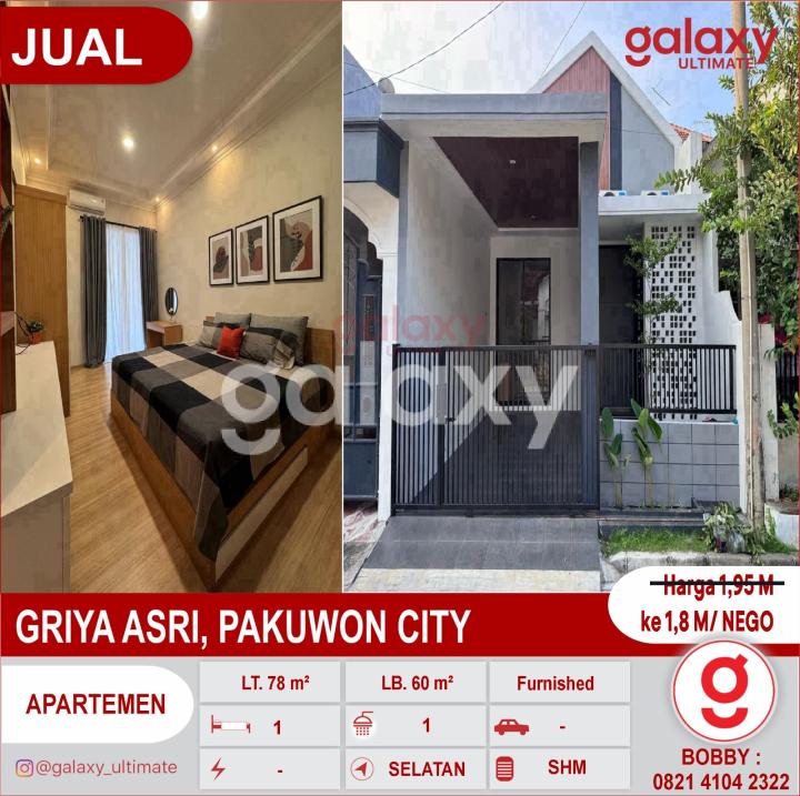 TURUN HARGA 150JT Rumah Sebelah Pakuwon City Mall Tinggal Bawa Koper Dijual rumah cantik di GRIYA ASRI, PAKUWON CITY Konsep modern compact house, cocok untuk mahasiswa/pelajar & pasangan muda * LT 78 m² (6x13) * LB 60 m² * 1 KT dan 1 KM * 1 suite master bedroom dengan kamar mandi dalam * New Furnished mewah & lengkap tinggal bawa koper * SHM * Selatan 📍 1 Menit ke Pakuwon City Mall 1 Menit Ke Gloria School 1 Menit Ke Xin Zhong School 1 Menit ke Al Azhar School 1 Menit ke Cita Hati School 9 menit ke ITS Dekat Papaya Supermarket Dekat Hokky Supermarket Harga 1,95 ke 1,8 M NEGO More Info : Bobby Galaxy Ultimate